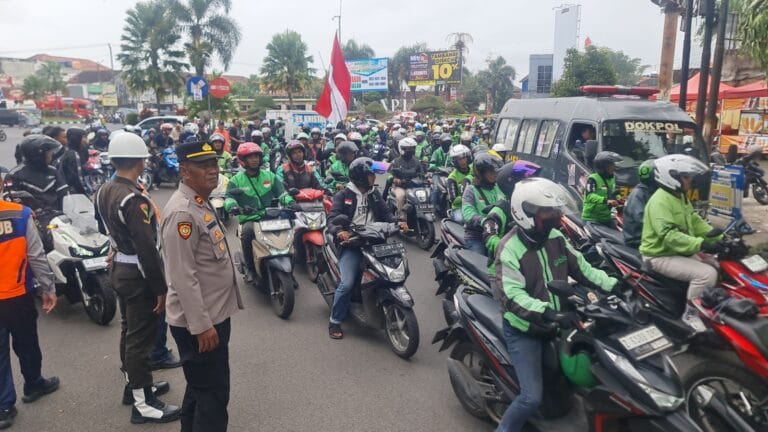 Garut. Mediagempar.web.id– Ribuan massa dari Solidaritas Aliansi Driver Online Garut Bersatu (ADOGB) menggelar aksi damai di Bundaran Simpang Lima, Jalan Patriot, Kecamatan Tarogong Kidul, Kabupaten Garut, Jawa Barat pada Jum’at (29/08/2025). Aksi ini diikuti ribuan peserta.