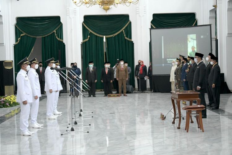 Prosesi dilanjutkan dengan pengambilan sumpah jabatan dan pelantikan kedua pasangan tersebut oleh Gubernur Jabar Ridwan Kamil.