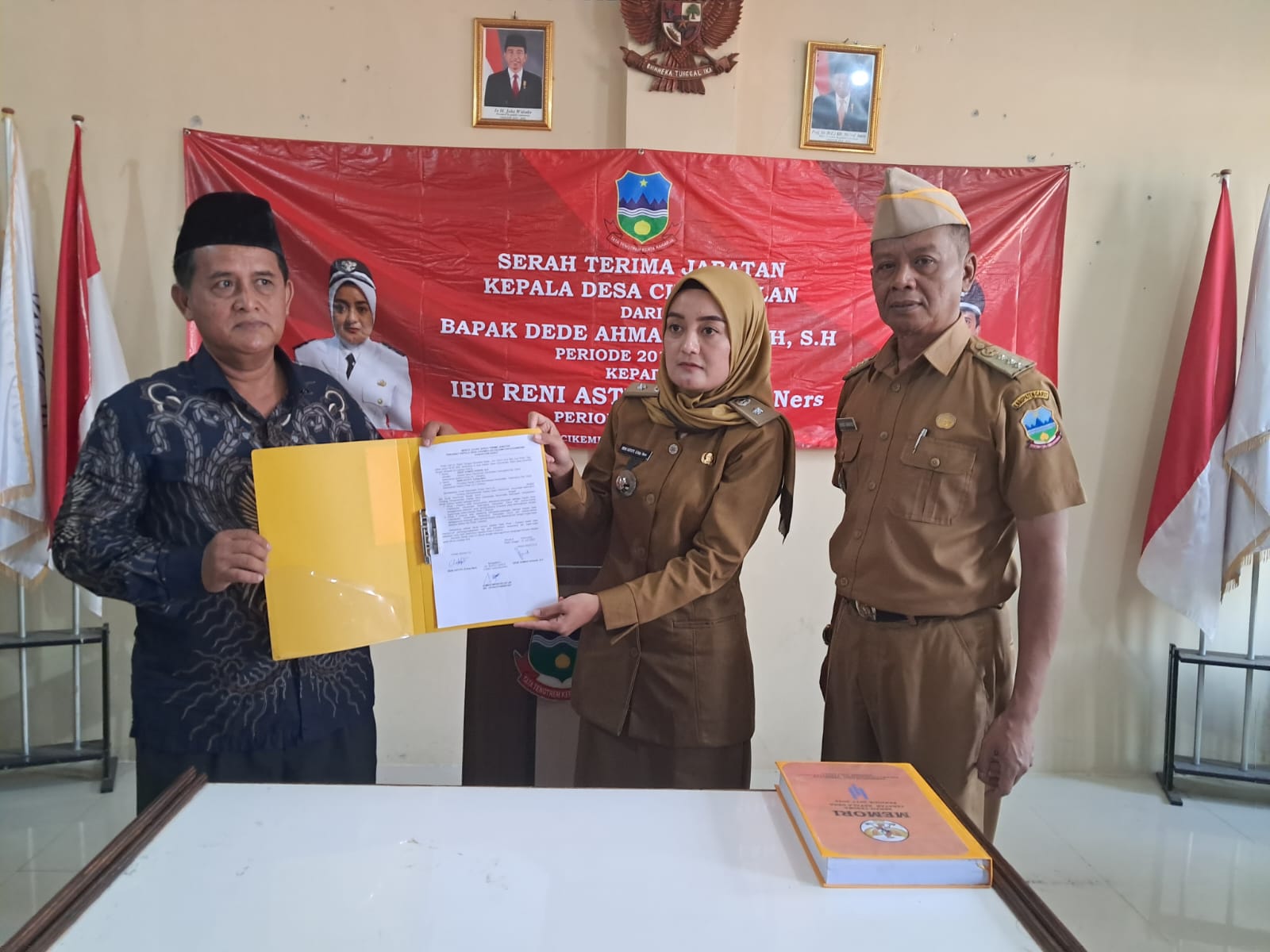 Garut, mediagempar.web.id- Serah Terima Jabatan (Sertijab) Kepala Desa Cikembulan yang lama, Dede Ahmad Kosasih, SH kepada yang baru, Reni Astuti, S.Kep.,Ners disaksikan langsung oleh Camat Kadungora Ahmad Mawardi,AP,SE di Kantor Desa Cikembulan, Senin (19/6/2023).