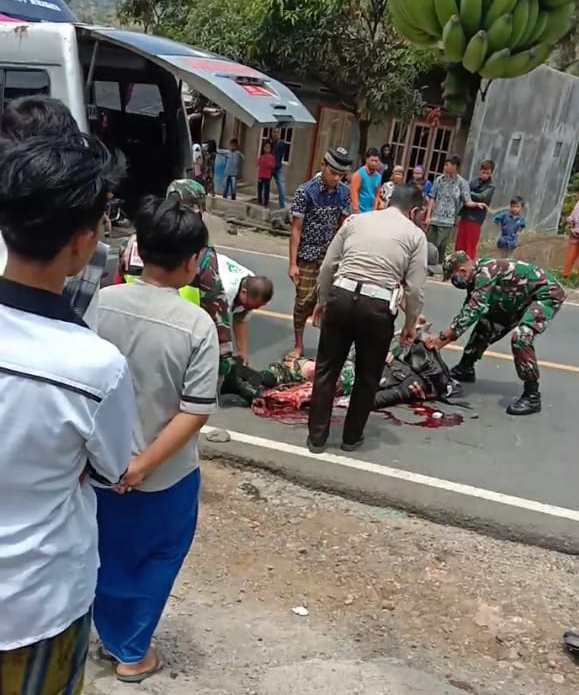 Diduga sementara Rem Blong, Pengemudi Motor yang di kenadarai seorang TNI Slamet Sugianto tergilas dan meninggal di tempat kejadian.