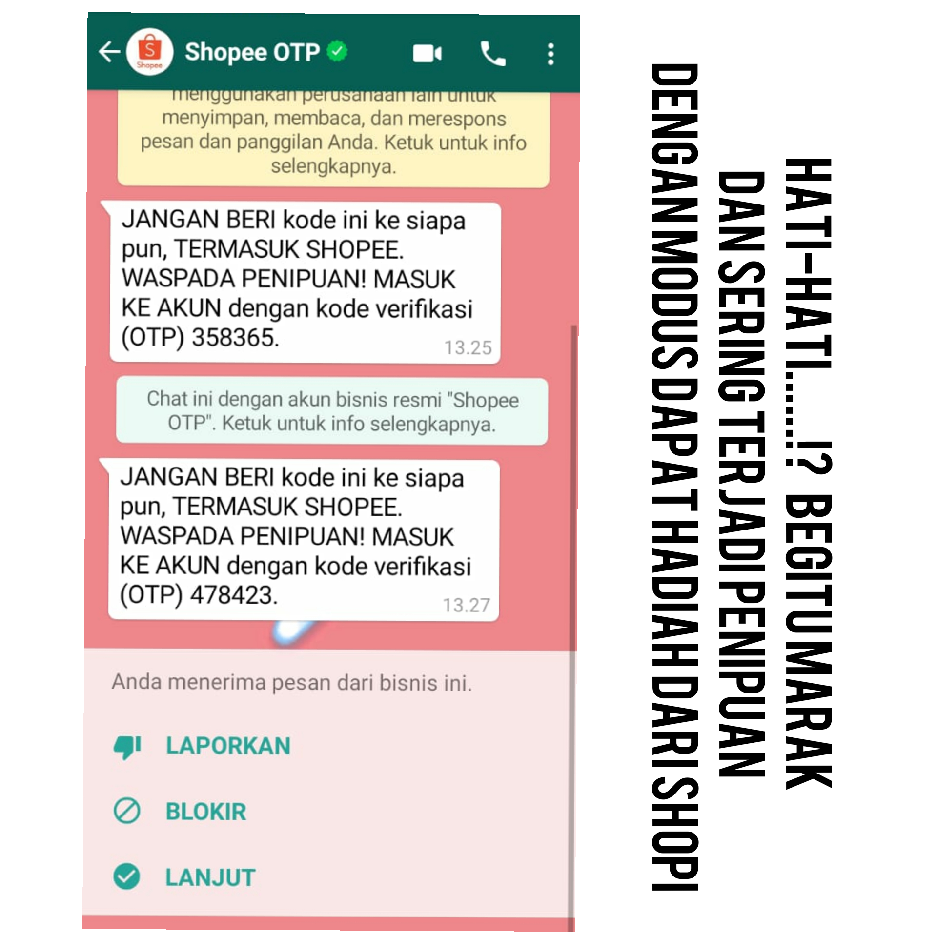 Hati-Hati……!? begitu marak dan sering terjadi penipuan dengan modus dapat hadiah dari shopi,korban kebanyakan Di suruh ke al-fa mart.dan kalau sudah di al-fa mart pelaku minta di transfer dan pelaku minta untuk di poto wajah korban,dengan alasan untuk memberikan hadiahnya.