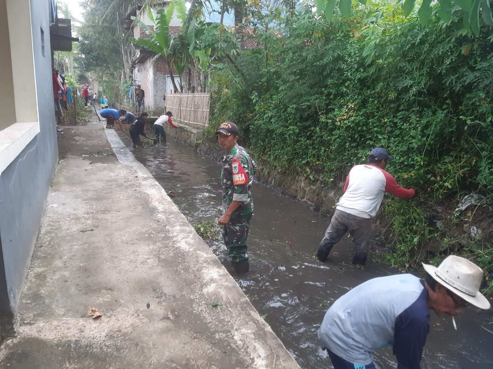 Meski cuaca ekstrim dan kondisi penuh dengan sampah basah sisa hujan, semangat warga tetap luar biasa. Ada yang mencangkul, membersihkan selokan, sampai membersihkan sampah yang mengganggu saluran air. Semua dikerjakan bersama, dengan suasana penuh kekeluargaan dan canda